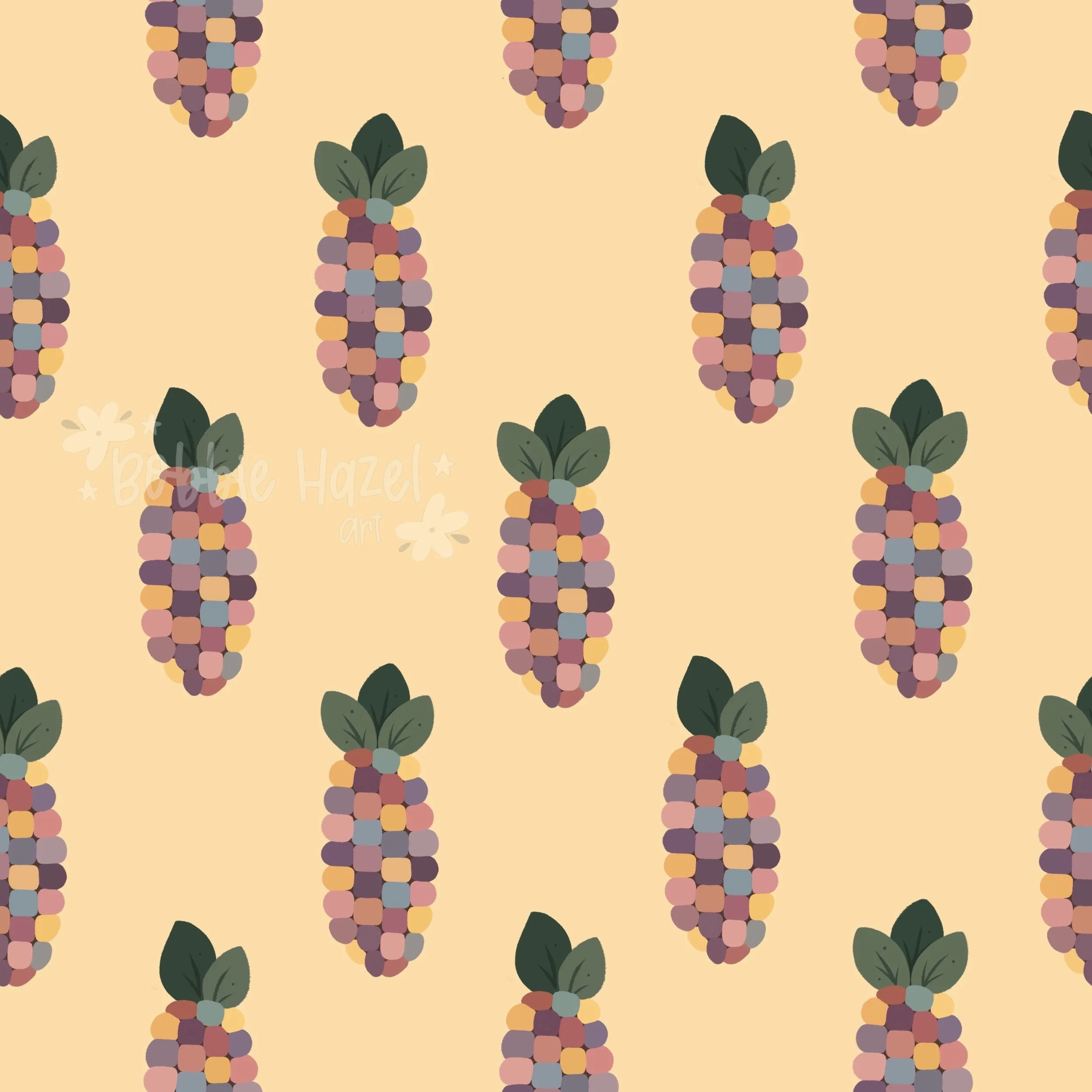 This fabric was inspired by gem corn, the rainbow-colored variety of corn that looks like tiny jewels scattered across each ear. Gem corn has been grown for centuries and is often used for decoration, harvest festivals, and even art! Each kernel comes in vibrant shades of red, orange, yellow, purple, and blue, making every ear unique—just like your creative projects. I loved the idea of turning these little “corn jewels” into cute patterns.